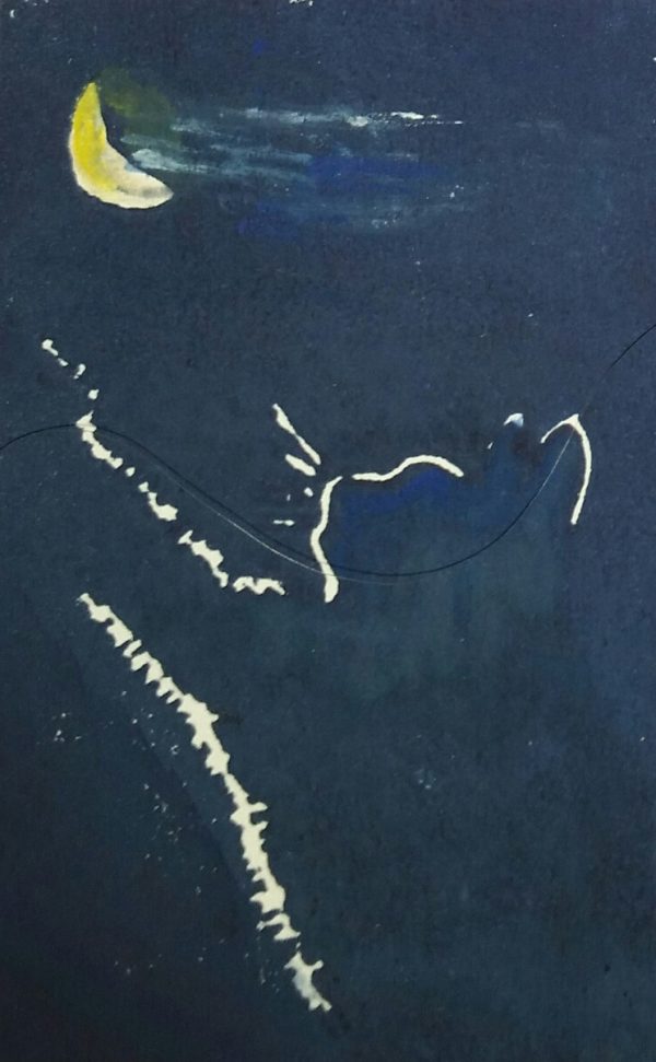 Das ist ein handcolorierter Linoldruck, wie immer eingeschweisst in Kredktkartengrösse. Rückseite signiert.
